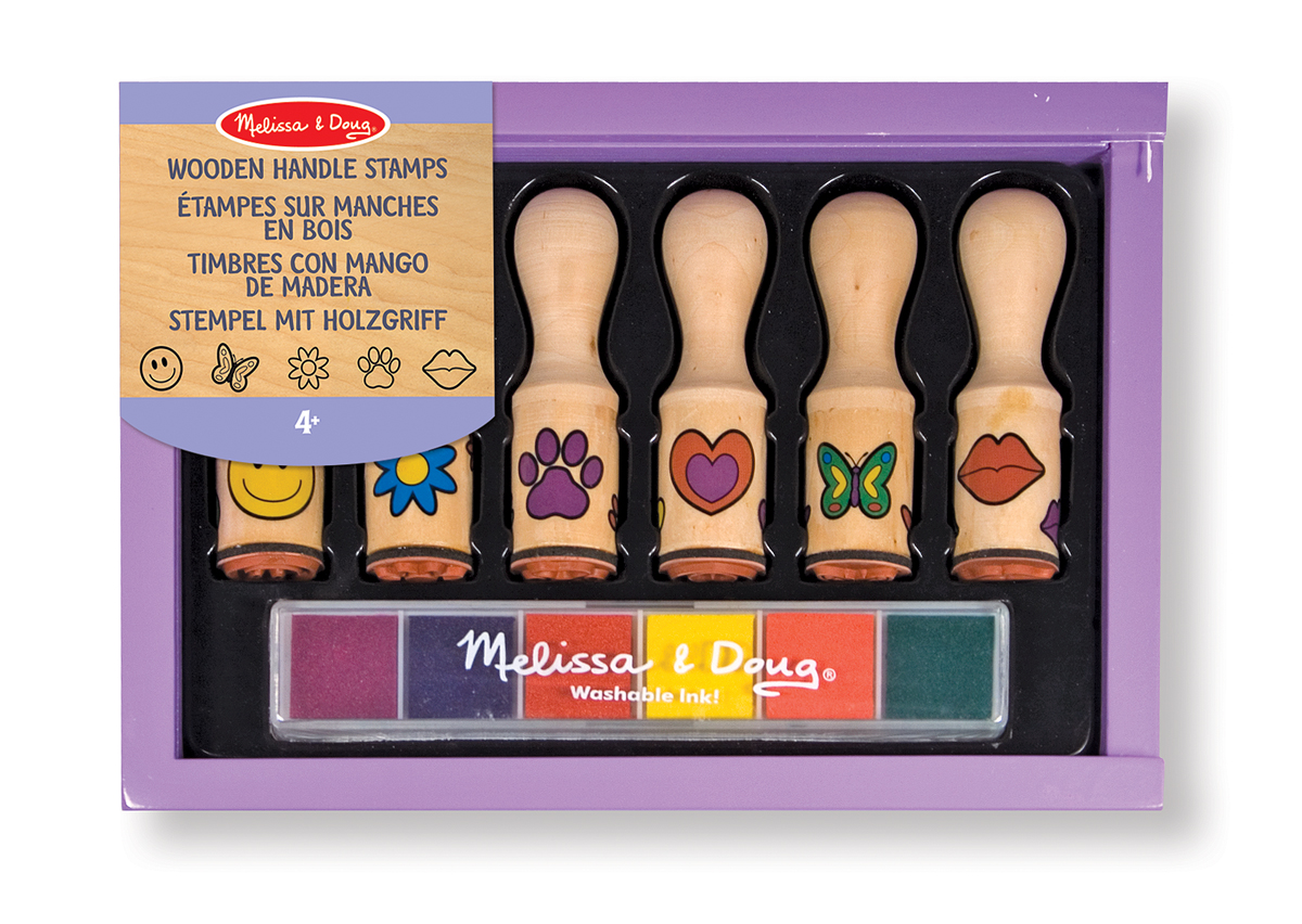 Zestaw zawiera 6 różnych drewnianych stempelków oraz 6 kolorowych tuszy. Z boku stempelka znajduje się kolorowy obrazek określający dany symbol. Maluch będzie miał dużo frajdy dzięki temu zestawowi. Stempelki sprawdzą się do dekorowania zaproszeń, laurek i kartek.