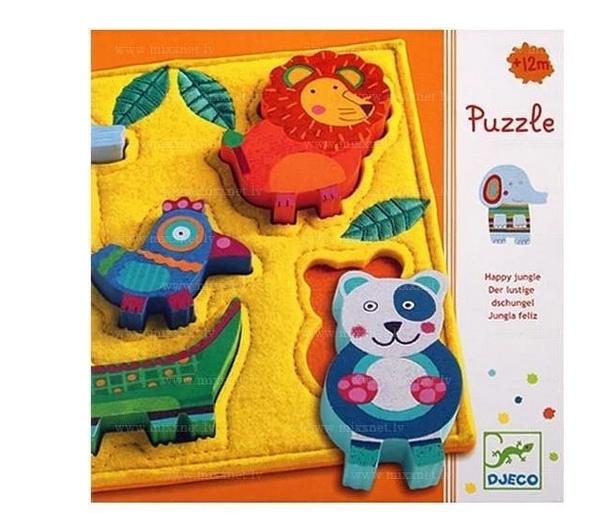 Puzzle drewniane - Dżungla to edukacyjne puzzle kształtowe przeznaczone dla najmłodszych dzieci. Trójwymiarowe, drewniane figurki zwierząt (slonik, lew, ptaszek, krokodyl i miś) pozwalają małym rączką bez trudu ułożyć tę układankę. Podstawa puzzli obłożona jest kolorowym, miękkim filcem.Zwierzątkami można sie bawic w zabawy tematyczne,po wyjęciu z podstawy. Walory edukacyjne:ćwiczenie małej motoryki dłoni,koncentracji,spostrzegawczości,wyobraźni. Wiek dziecka :12 miesięcy + Wymiary : 21 x 21 x 2,5 cm Wielkość opakowania : 22,6 x 22,6 x 2,5 cm