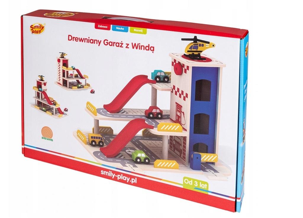 Opis produktuZasady bezpieczeństwaDrewniany Garaż z Windą to doskonała zabawka na wiele godzin zabawy dla małych miłośników motoryzacji. Trzy poziomy parkingu mają wydzielone pasy ruchu oraz miejsca parkingowe.W zestawie znajdują się 4 samochody, 1 helikopter i winda. Auta mogą być transportowane na każdy z poziomów parkingu przy użyciu ruchomej windy, do której dostępu strzeże podnoszony szlaban; wystarczy wjechać autem do kabiny i za pomocą pokrętła wciągnąć lub opuścić windę na poszczególne poziomy. Drewniany Garaż z Windą: • 4 drewniane auta, helikopter i winda wciągana na sznurku • 3 poziomy parkingu • Zjeżdżalnie dla aut Drewniany Garaż z Windą pomaga rozwijać umiejętności: • Rozwijając małą motorykę • Koordynację wzrokowo – ruchową x