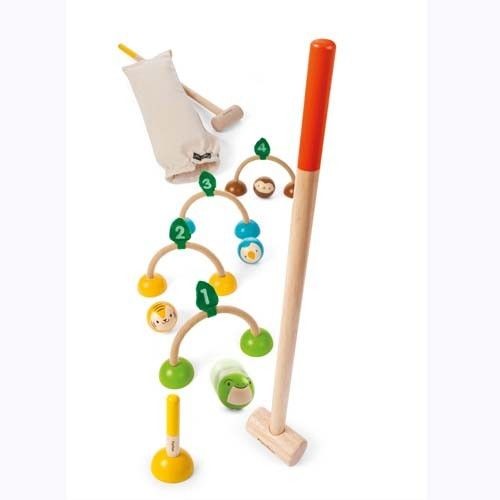 Zestaw zawiera 4 drewniane kulki, 2 młotki, 4 bramki i końcowe stanowisko.