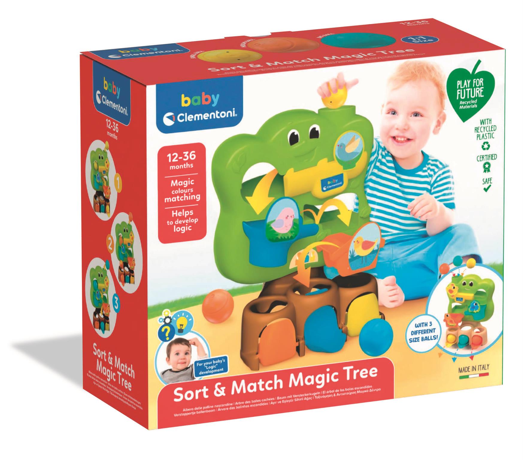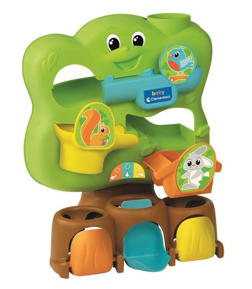 Zabawne drzewko z 3 kulkami i mechanizmem do zrzucania kul. Każda piłka zakończy swoją trasę w drzwiach tego samego koloru, stymulując logikę przyczyny-skutku.