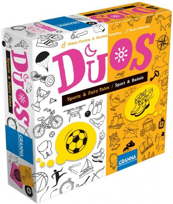 Opis produktuZasady bezpieczeństwaW ""DUOS"" liczy się kreatywność oraz umiejętność przywidywania skojarzeń pozostałych uczestników rozgrywki. Szybkie rundy i masa ciekawych rozmów nad stołem to właśnie ""DUOS"", towarzyska gra, która sprawdzi się zarówno w gronie rodziny, jak i znajomych. Jednocześnie na rynku zadebiutują dwa pudełka. Każde zawiera 2 kategorie i wszystko co potrzebne jest do zabawy. Zawartość obu można połączyć! Zawartość pudełka