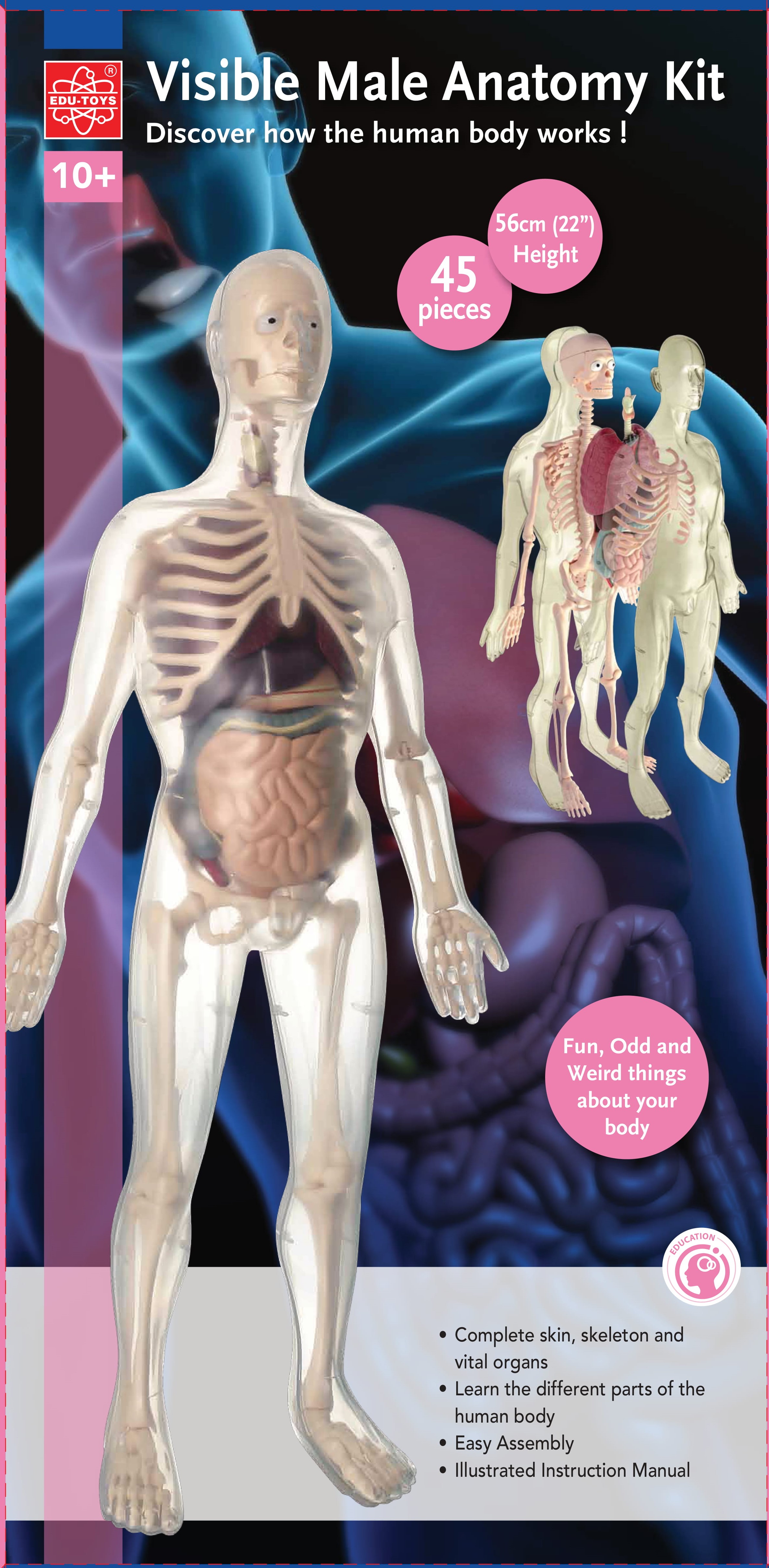 Model Człowieka - Mężczyzna Jest to model ludzkiego ciała o długości 56 cm i zawiera 45 elementów. Wiek 8+ Ten model bardzo dokładnie i realistycznie pokazuje ważne części ludzkiego ciała. Dowiemy się jak funkcjonuje organizm poprzez wyciąganie pojedynczych narządów oraz zobaczymy jak pracują one nawzajem ze sobą by utrzymać człowieka żywego i zdrowego. Wykonany jest z lekkich, przezroczystych tworzyw sztucznych. Model MK002 jest bardzo łatwy w montażu i służy do edukacji, zabawy, a także może być używany do pokazów przez biologów czy lekarzy. Posiada instrukcje w języku polskim, która w bardzo szczegółowy sposób opisuje wszystkie części ciała, a także opisuje jak funkcjonują poszczególne układy, a na koniec możemy przeczytać o kilku ciekawostkach związanych z naszym organizmem. x