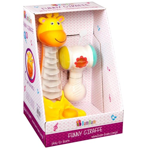 Interaktywna ZABAWNA ŻYRAFA bez wątpienia zaniteresuje i na długo zabawi malucha. Dzięki uderzeniom młoteczka w przycisk umiejscowiony w podstawie zabawki, następuje eksplozja kolorowych kuleczek. Dodatkowa atrakcją są mile brzmiące dźwięki na skutek uderzania młoteczkiem. Zabawka dedykowana jest dla dziecci od 6 m-ca.