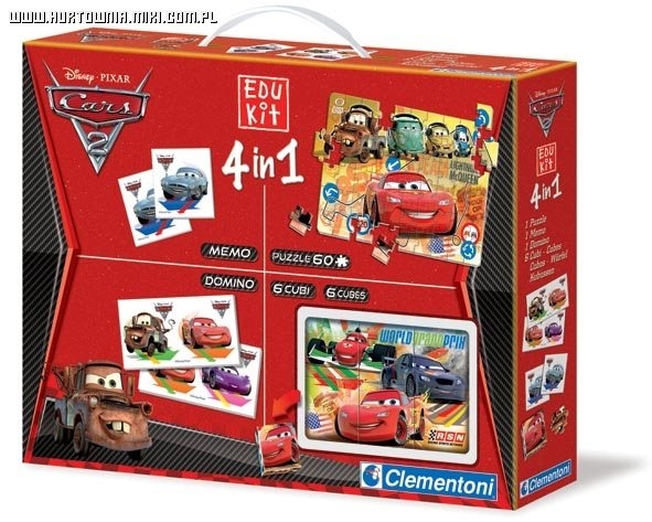 Zestaw Clementoni Edukit 4 w 1 Cars.Zestaw składa się z puzzli, klocków, memo oraz domino.W zestawie znajdują się 2 rodzaje układanek: puzzle składające się z 30 elementów oraz klocki- 6 kostek z których można ułożyć obrazki.Do zestawu dołączono również 2 gry: Memo i Domino w tej samej tematyce.