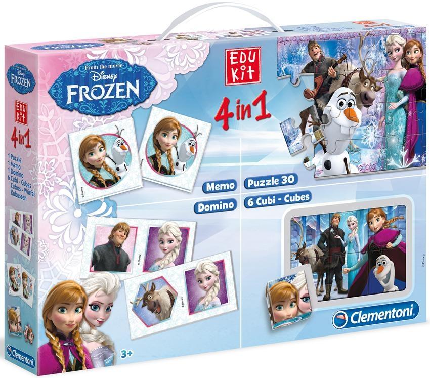 Zestaw Clementoni Edukit 4 w 1.Zestaw składa się z puzzli, klocków, memo oraz domino.W zestawie znajdują się 2 rodzaje układanek: puzzle składające się z 60 elementów oraz klocki- 6 kostek z których można ułożyć obrazki.Do zestawu dołączono również 2 gry: Memo i Domino w tej samej tematyce.