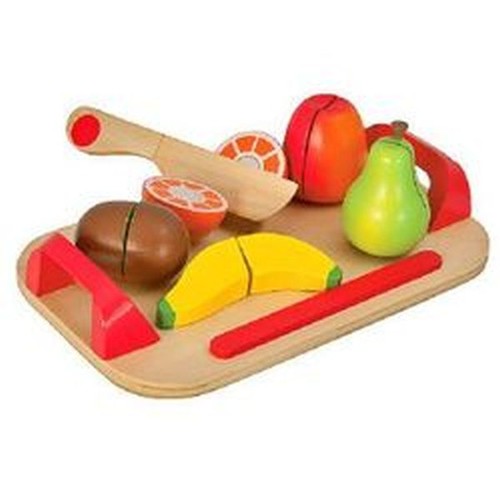 Deska z owocami - drewniane połówki owoców, drewniany nożyk oraz deska kuchenna.