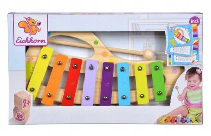 EH Drewniane cymbałki, 30 cm Drewniane cymbałki z 8 metalowymi, kolorowymi płytkami do wygrywania melodii, dołączony arkusz z nutami do piosenek. Wymiary: 30 x 15 cm, 2l+. x