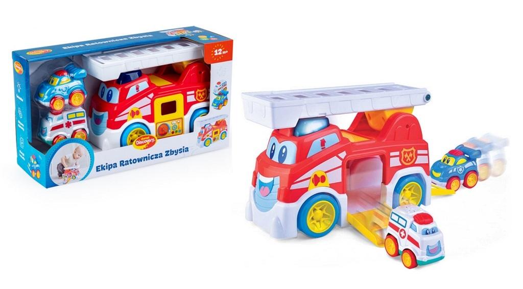 Wciel się w rolę strażaka i razem z tymi uśmiechniętymi samochodzikami przeżyj niesamowitą przygodę rozwijając przy tym własną wyobraźnię. Największy z pojazdów- Zbysio posiada na dachu rozsuwaną drabinę oraz otwierane drzwiczki. W jego wnętrzu kryją się dwa mniejsze autka. Zbysio posiada z boku aktywny przycisk, który uruchamia realistyczny dźwięk i światełko