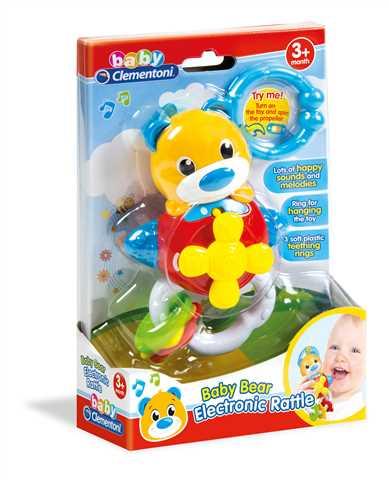 Elektroniczna grzechotka z pluszowym misiem . Wesoła elektroniczna grzechotka w kształcie latającego samolotu z pilotem pluszowego misia, który widzi najmłodsze dzieci! Gdy helikopter obraca się, dzieci mogą słuchać wielu zabawnych dźwięków i wesołych melodii. Trzy wiszące na uchwycie wisiorki wykonane są z miękkiego plastiku, dzięki czemu idealnie nadają się do ukąszenia dziecka. Grzechotka ma praktyczny pierścień, który wisi na wózku.