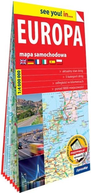 Na mapie m.in.: cały obszar Europy w jednej skali 1:4 000 000, aktualny stan dróg, autostrady w budowie, 5 kategorii dróg, międzynarodowa i krajowa numeracja dróg, odległości drogowe w kilometrach, promy samochodowe, indeks ponad 10 000 miejscowości. x