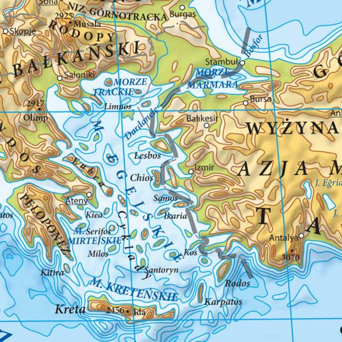 Znakomicie przygotowana, dwustronna podkładka na biurko, z mapą Europy w skali 1:12 000 000, polityczną (awers) oraz fizyczną (rewers). Prezentuje najważniejsze, aktualne informacje o kontynencie, na którym leży Polska. Ciekawie zaprojektowana, oprócz map, mieści również dodatkowe elementy, pomocne w poznawaniu świata.