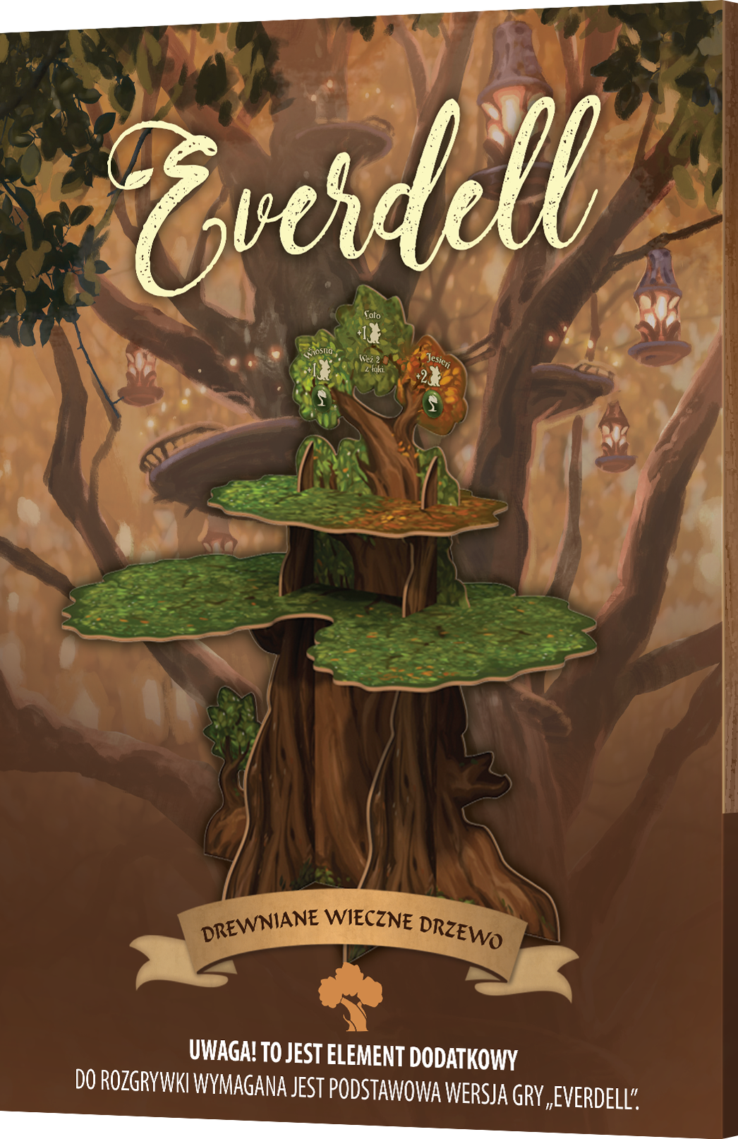 Opis produktuZasady bezpieczeństwaUwaga! To nie jest samodzielna gra! Do rozgrywki wymagana jest podstawowa wersja gry: Everdell (edycja polska). Solidny pień, który utrzyma karty i robotników! Zapewnij swoim rozgrywkom w Everdell podstawę solidną niczym pień Wiecznego Drzewa! Ten zestaw dodatkowy stanowi alternatywną wersję kartonowego, trójwymiarowego elementu, który znajdziesz w podstawowej wersji gry. Możesz go składać i rozkładać bez obaw o uszkodzenia lub skleić, by zachował swój kształt na stałe. Jedno jest pewne: podczas rozgrywek będzie górował nad stołem, będąc jednocześnie jego ozdobą! Czym jest Everdell? To dynamiczna gra oparta o mechanikę przydzielania pracowników. Uwodzi przepięknym wykonaniem i oferuje wiele dróg do zwycięstwa, dzięki czemu jej odkrywanie jest prawdziwą przyjemnością. To również gra bardzo wielu możliwości, która zmienia się z każdą partią: na raz wykorzystujemy tylko niewielką część komponentów, a zmienne układy na planszy gwarantują stopniowe odkrywanie różnorodnych strategii. Zawartość: - drewniane Wieczne Drzewo do samodzielnego złożenia x
