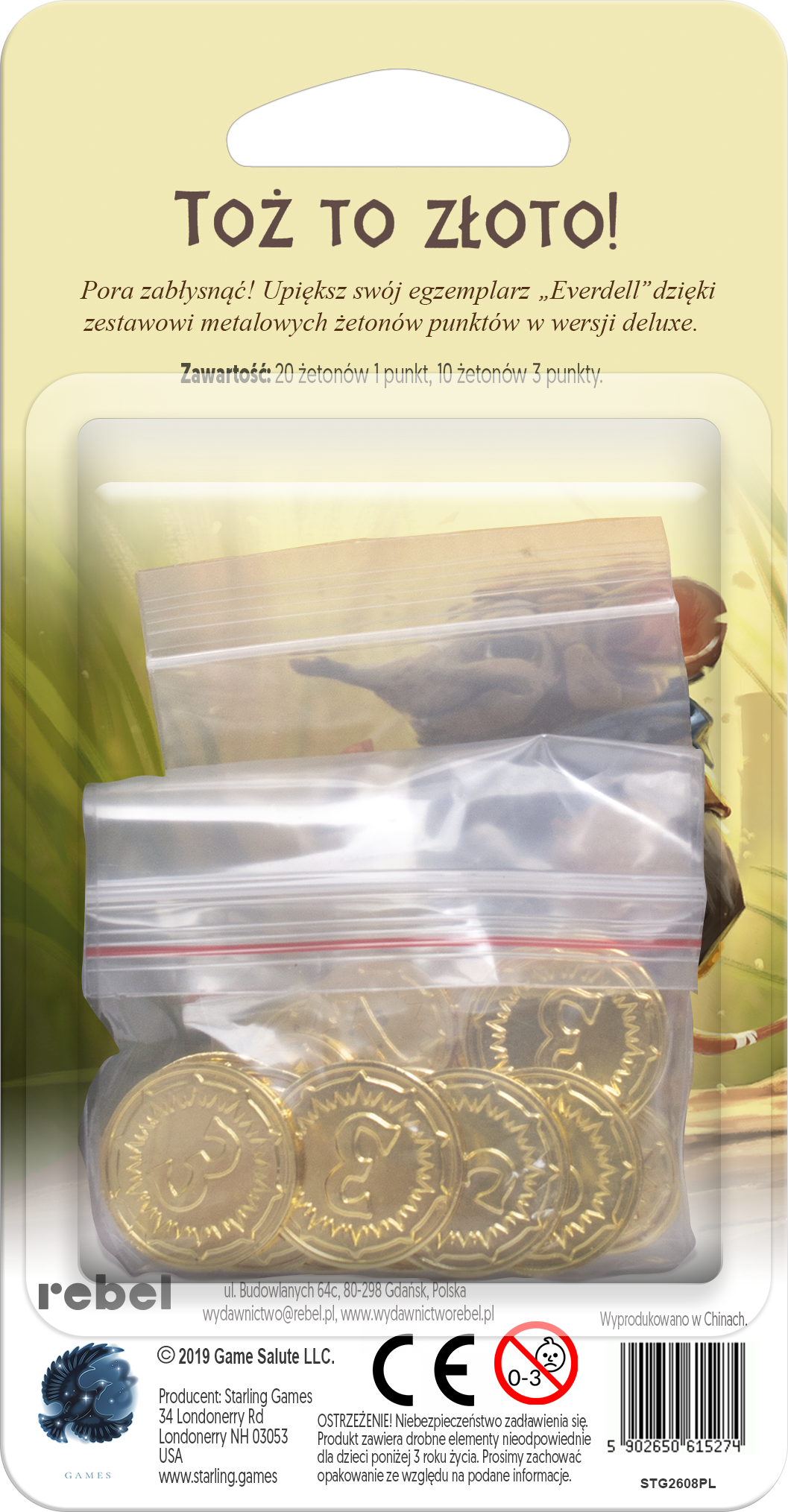 Opis produktuZasady bezpieczeństwaUwaga! To nie jest samodzielna gra! Do rozgrywki wymagana jest podstawowa wersja gry: Everdell (edycja polska). Już dziś rozszerz swoją kolekcję wyjątkowych akcesoriów i zastąp standardowe znaczniki punktów zwycięstwa zestawem metalowych monet! W połączeniu z dopracowaną stylistyką i wysoką jakością wykonania elementów podstawowych Everdell, stanowią one ciekawy dodatek podnoszący przyjemność z gry. x