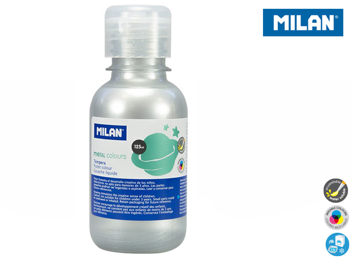 Farba tempera 125 ml w kolorze srebrnym. Farby tempery zawierają bardzo dużo pigmentu. Są gęste przez co bardzo dobrze kryją malowaną powierzchnię. Żywe, intensywne kolory zachęcają dzieci do pracy. Idealne do bezpośredniej aplikacji lub po rozcieńczeniu wodą. Łatwo się spierają niemal z każdej powierzchni. Przezroczysta butelka ze specjalnym aplikatorem. Farby MILAN są zgodne z europejskimi i amerykańskimi normami bezpieczeństwa. Nie zawierają ftalanów, metali ciężkich i innych substancji toksycznych. Są bezpieczne dla dzieci.