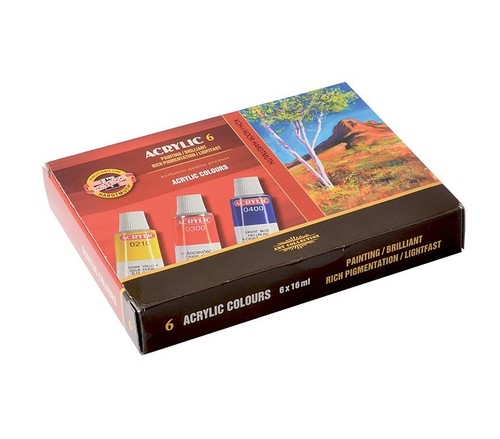 Opis produktuZasady bezpieczeństwaFarby wodne, trwale zasychające, po wyschnięciu pozostawiające powierzchnię nie odbarwiającą się, elastyczną i odporną na wodę. Nadają się do malowania na papierze, kartonie, płótnie, drewnie, sklejce, masach plastycznych itp., wolnych od substancji oleistych. Charakteryzują się intensywnością barw, płynną konsystencją, oraz wizualizacją pracy pędzla. Można je swobodnie ze sobą mieszać uzyskując szeroką gamę efektów kolorystycznych. W połączeniu z wodą tworzą cienką transparentną powłokę, która rozprowadza się podobnie jak akwarela. Do technik wymagających gęstej farby należy używać farby wyciśniętej bezpośrednio z tubki. Przed jej użyciem po długim okresie nie używania wyciśniętą porcję należy dokładnie wymieszać. Mogą służyć jako podkład do farb olejnych. Pędzle nie zaschnięte po użyciu farb akrylowych można myć w wodzie. Komplet 6 kolorów 16 ml. x