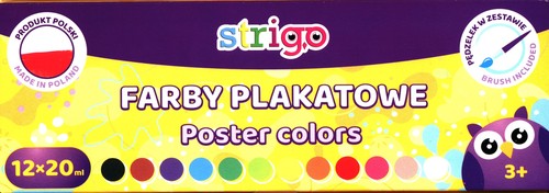 Farby plakatowe Strigo, dostępne w 12 głębokich kolorach dają nieskończone możliwości zabawy i tworzenia nowych kolorów.