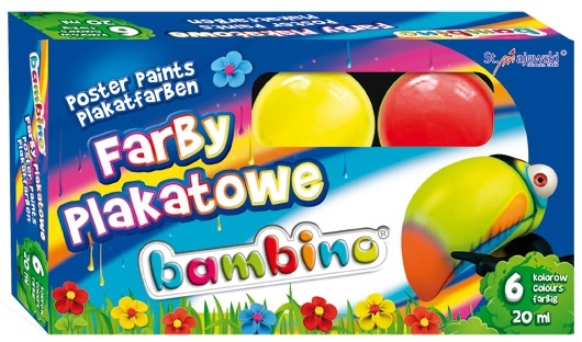 Farby plakatowe Bambino są farbami o czystych i nasyconych barwach. Mogą być stosowane bez użycia wody, nie skraplają się na podłożu. Po wyschnięciu wymalowanie jest matowe, barwy intensywne, odporne na działanie światła i ścieranie. Ze względu na znakomitą jakość idealnie rozprowadzają się na papierze, kartonie, drewnie, ceramice, kamieniu. Mogą być stosowane do malarstwa witrażowego. Farby plakatowe Bambino są bezpieczne dla dzieci, ponieważ produkowane są w zgodności z dyrektywą Parlamentu Europejskiego i Rady w sprawie bezpieczeństwa zabawek oraz rozporządzeniem Ministerstwa Gospodarki w sprawie zasadniczych wymagań dla zabawek. Licencja - BAMBINO Ilość kolorów - 6 Cechy szczególne - Farba w słoiczkach o pojemności 20 ml