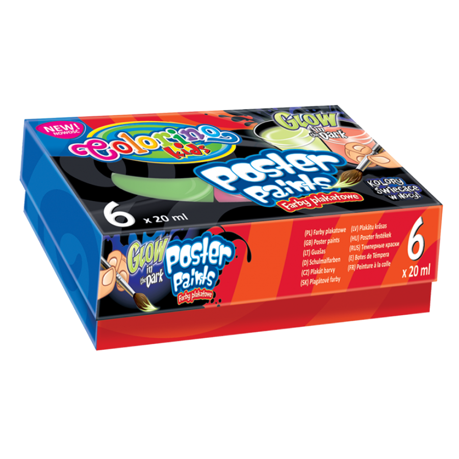 Świecące w ciemności farby plakatowe w 6 kolorach. Dzięki aksamitnej konsystencji farby doskonale rozprowadzają się po malowanej powierzchni. Kolory można z łatwością mieszać, co pozwala na rozszerzanie dostępnej palety barw. Nadają się do malowania na różnorodnych powierzchniach takich jak: papier, karton, drewno, ceramika. Nietoksyczne. Posiadają niezbędne atesty i certyfikaty.