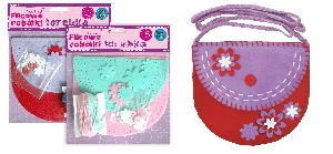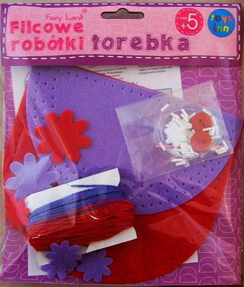 Uszyj własną torebkę!Zestaw zawiera: elementy z filcu gotowe do zszycia 2 guziki żyłkę wędkarską kolorowe nici bawełniane 40 szt koralików - rurek o długości 6 mm plastikową igłę szczegółową instrukcję.