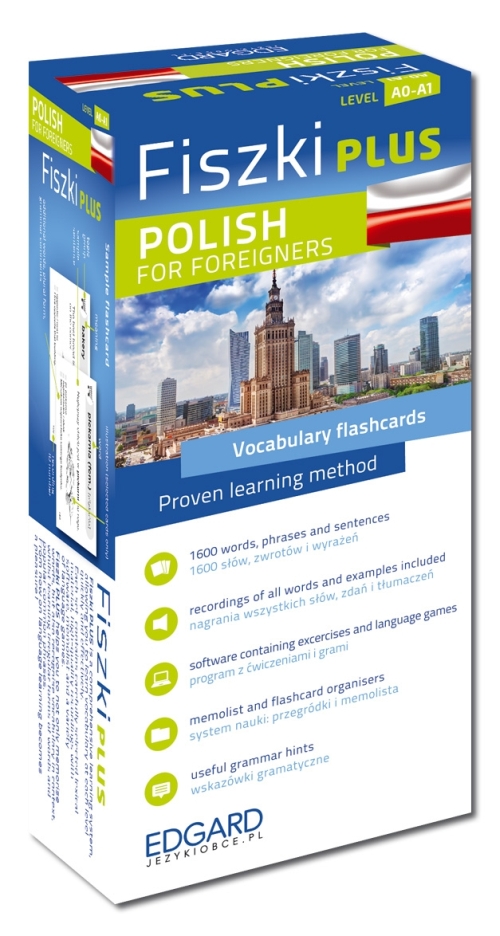 Opis produktuZasady bezpieczeństwaZestaw Fiszki PLUS Polski dla cudzoziemców zawiera: - łącznie 1600 słów, wyrażeń i zdań - nagrania wszystkich słówek i zdań oraz ich tłumaczeń – możliwość tworzenia własnych playlist - program z ćwiczeniami i grami językowymi (do pobrania) – nauka i rozrywka - system kolorowych przegródek i memolistę – szybka powtórka słówek - pomocne wskazówki gramatyczne Fiszki PLUS Polski Dla obcokrajowców (A0-A1) to pakiet 600 fiszek będący częścią rozbudowanego systemu nauki, dzięki któremu szybko i skutecznie nauczysz się najważniejszych słów, zwrotów i wyrażeń niezbędnych do swobodnego porozumiewania się po polsku. Każdy zestaw Fiszek PLUS to starannie przygotowany materiał, wysokiej jakości nagrania wymowy wraz z programem komputerowym, memolistą i grami językowymi. Z Fiszkami PLUS nie tylko zapamiętujesz słówka, lecz także poznajesz słownictwo w kontekście, uczysz się nieregularnych form oraz popularnych zwrotów językowych. Od dziś nauka języka stanie się przyjemnością! Set Fiszki PLUS Polish for Foreigners contains: - 1600 words, phrases, sentences - recordings of all words and examples included – enable you to create playlists according to your needs - software containing exercises and language games – learning via enjoyment - colourful flashcards organisers and memolist – express revision - useful grammar hints Fiszki PLUS Polish for Foreigners (A0-A1) is 600 flashcards packet and a part of a comprehensive learning system, allowing you to learn polish vocabulary at each level quickly and effectively. Each set Fiszki PLUS contains carefully selected lexical material, high quality recordings, with software, memolist and variety of language games. Fiszki PLUS helps you to not only memorise words, but also recognise vocabulary in context, whilst learning irregular forms of words and popular common phrases. From now on language learning becomes a pleasure! Sample words: dzisiaj jabłko ładny wesoły sok kolacja rozumieć biegać samolot paszport x