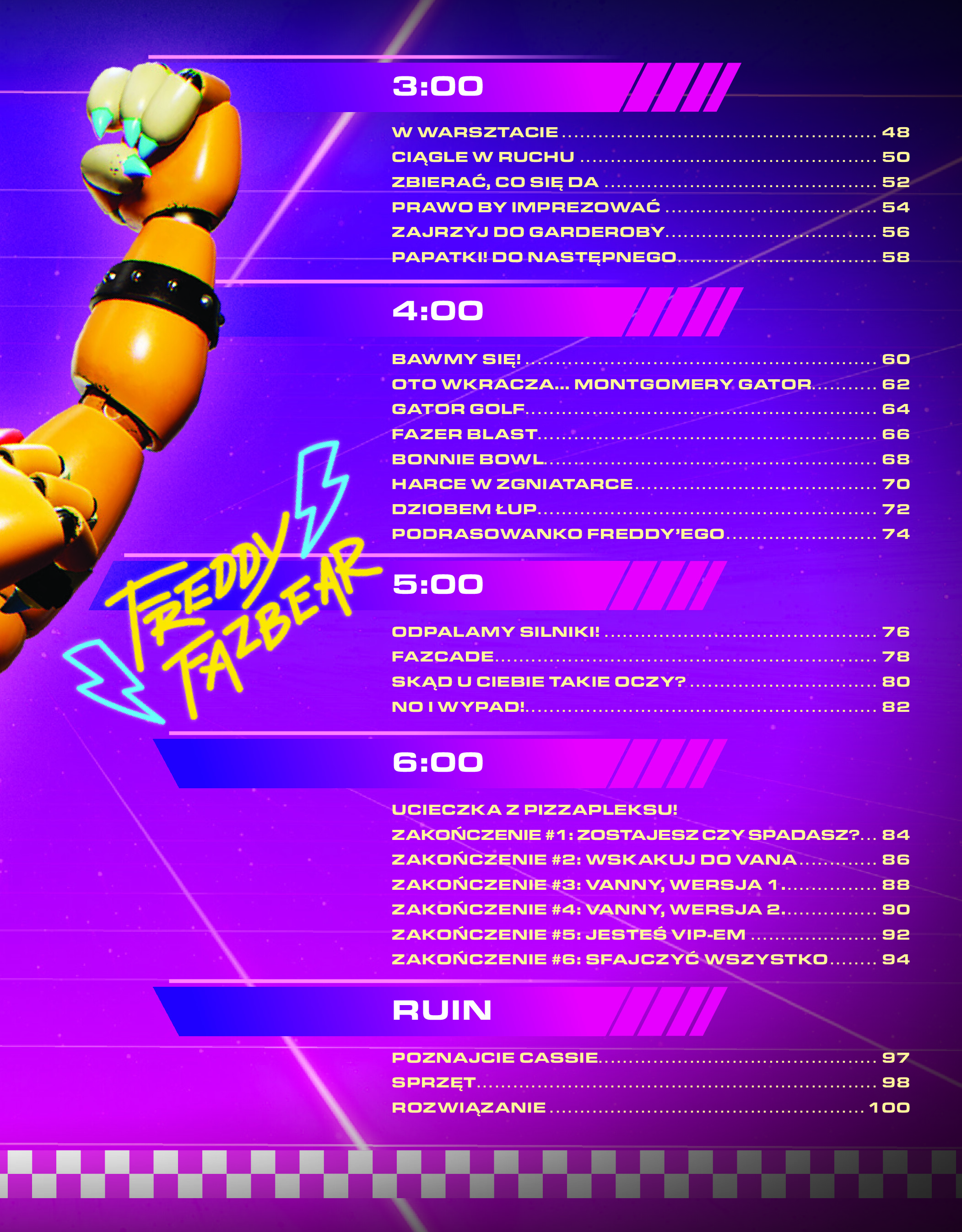 To obszerne kompendium, zawierające gameplay, sekrety, easter eggi i alternatywne za- kończenia zarówno głównej gry, jak i DLC, pogłębia wiedzę nawet najzagorzalszych graczy i wykłada jak na tacę wszystkie dowody i inne detale związane z najnowszą odsłoną świata Five Nights at Freddys.