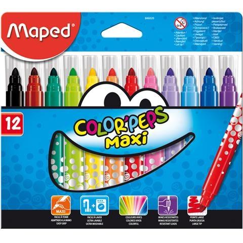 Flamastry COLORPEPS 12 sztuk w kartonowym etui. Wentylowana skuwka. Tusz łatwo zmywalny ze skóry i tekstyliów. Mocna, gruba końcówka jest wytrzymała na nacisk. Intensywne kolory.