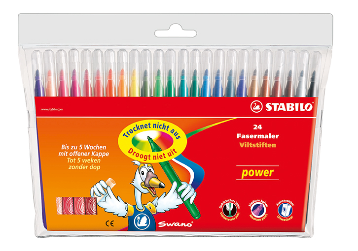 Niezasychające flamastry STABILO power - pozostawione bez skuwki nie zasychają nawet przez 5 tygodni. Dodatkowe zalety to łatwospieralny tusz, mocna końcówka i intensywne kolory. Plastikowe etui z zawieszką. Opakowanie 24 szt.