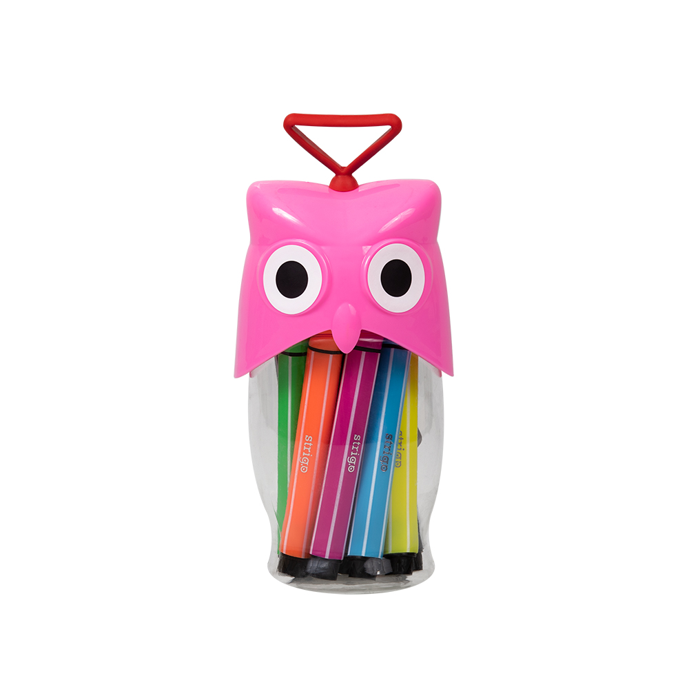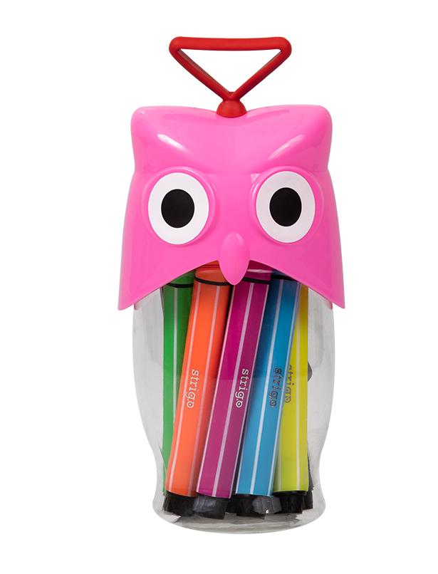 Flamastry z sowią główką. 12 głębokich kolorów flamastrów z łatwym do usunięcia tuszem, zamkniętych w uroczym pojemniku z sowią główką jako zakrętką. Pozwalają na stworzenie prac pełnych kolorów, a sowie oczy z podziwem wpatrują się w młodego artystę! ;)