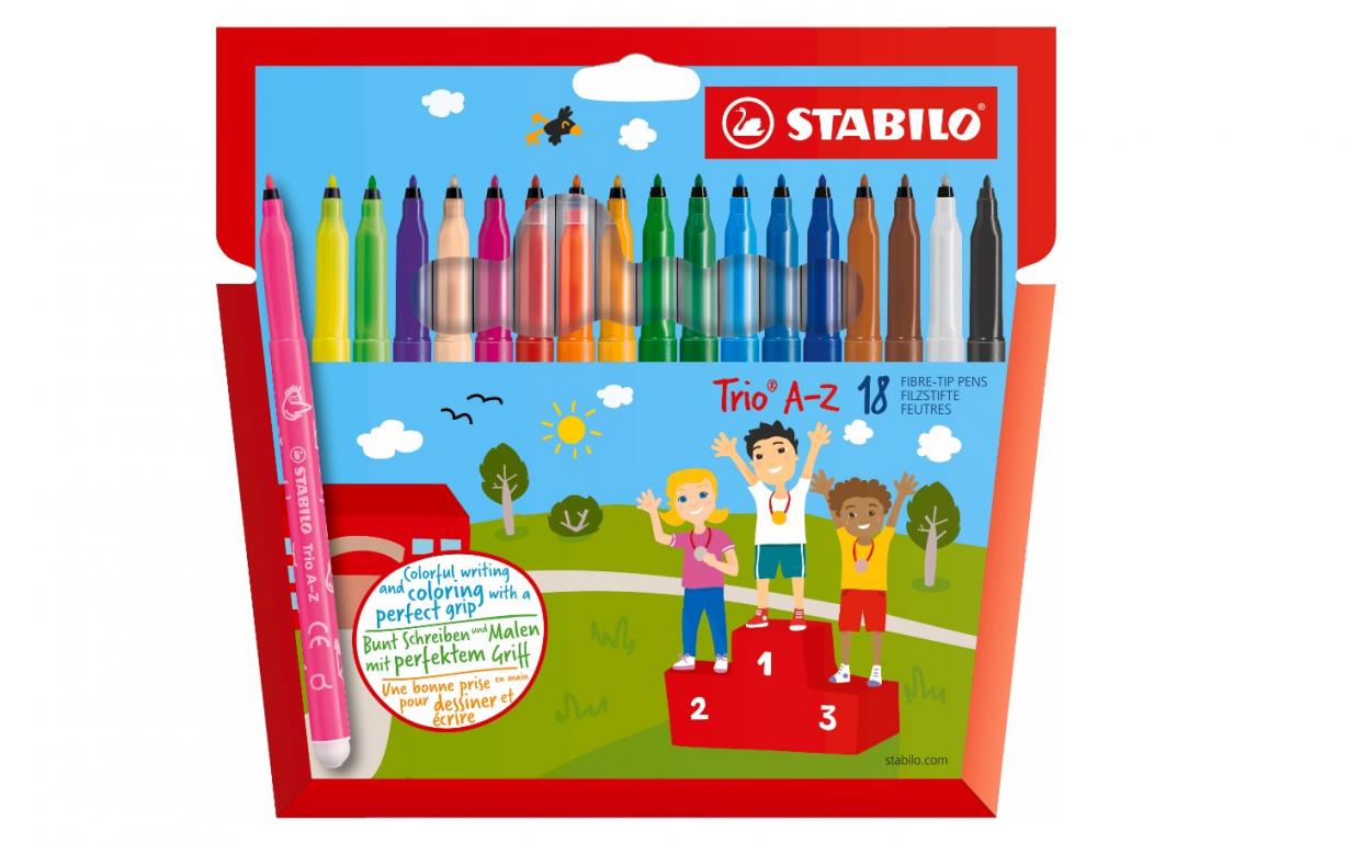 FLAMASTRY Z TRÓJKĄTNYM UCHWYTEM STABILO TRIO A-Z. KREATYWNOŚĆ OD A DO Z. Ergonomiczny, trójkątny uchwyt oraz mocna, odporna na złamanie końcówka. Flamastry posiadają wentylowaną skuwkę oraz łatwospieralny tusz.Kartonowe etui z zawieszką. 18 szt.