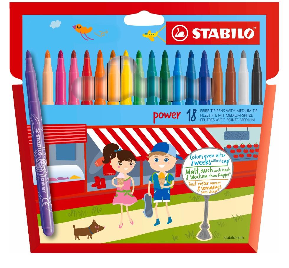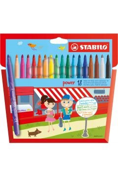 FLAMASTRY STABILO POWER POZOSTAWIONE BEZ SKUWKI NIE ZASYCHAJĄ NAWET PRZEZ 5 TYGODNI. Bardzo mocna końcówka, skuwka odporna na złamanie. Łatwo spieralny oraz odporny na wysychanie tusz umożliwia łatwe zmywanie go z dłoni oraz ubrań.Kartonowe etui z zawieszką. 18 szt.