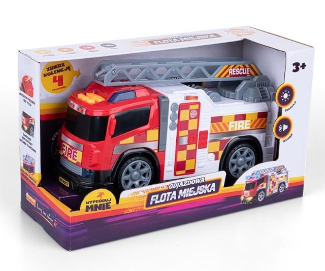 Opis produktuZasady bezpieczeństwaWóz straży pożarnej wyposażony w 4 aktywne przyciski uruchamiające poszczególne funkcje: jazdę do przodu, do tyłu, zapalanie świateł oraz realistyczne dźwięki. Kiedy silnik pojazdu nie jest uruchomiony, koła swobodnie się poruszają, co umożliwia prowadzenie go ręką. Pojazd posiada ruchomą drabinę.
