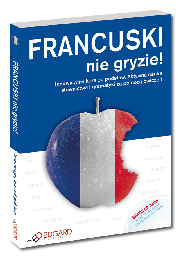 FRANCUSKI nie gryzie! to kurs, z którym:- aktywnie uczysz się języka od podstaw,- przyjemnie poznajesz użyteczne słownictwo,- praktycznie trenujesz znajomość gramatyki,- uczysz się gotowych zwrotów konwersacyjnych,- poznajesz współczesny, codzienny język francuski.Kurs przeznaczony jest zarówno dla uczniów, jak i dorosłych samouków dopiero zaczynających naukę, którzy chcą łatwo i przyjemnie opanować podstawy języka francuskiego na poziomie komunikatywnym. Książka (168 str.) opiera się na niezwykle atrakcyjnej metodzie aktywnej nauki języka poprzez rozwiązywanie różnorodnych ćwiczeń. W rozdziałach tematycznych znajdziesz: około 90 najpopularniejszych zagadnień, krótkie dialogi lub teksty z polskim tłumaczeniem, gramatykę w pigułce, porcję niezbędnego słownictwa, ćwiczenia, ciekawostki o kulturze oraz specjalną sekcję Sprawdź się z zadaniami podsumowującymi. W każdej chwili masz dostęp do umieszczonych na marginesach praktycznych minisłowniczków, a dodatkowo na końcu książki znajdziesz podręczny zbiorczy słownik.GRATIS płyta CD Audio z ponad 70 minutami nagrań profesjonalnych lektorów, która pomaga w nauce poprawnej wymowy i skutecznym zapamiętywaniu niezbędnych słów i zwrotów.Odkryj unikalną metodę aktywnej nauki. Przekonaj się, że francuski nie gryzie!