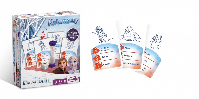 Kraina Lodu 2 Kalambury: Klasyczna gra w KALAMBURY, która spodoba się każdemu. Do pokazania mnóstwo rzeczy i zadań, takich jak jazda na łyżwach, śnieżyca czy jednorożec wystawi na próbę zdolności aktorskie każdego uczestnika. Dla młodszych uczestników gry przeznaczone są obrazki, aby każdy mógł przyłączyć się do gry. Świetna zabawa dla wszystkich graczy spróbujcie odgadną hasło przed upływem czasu. Wygrywa gracz, który jako pierwszy zbierze 4 karty. Cechy gry: