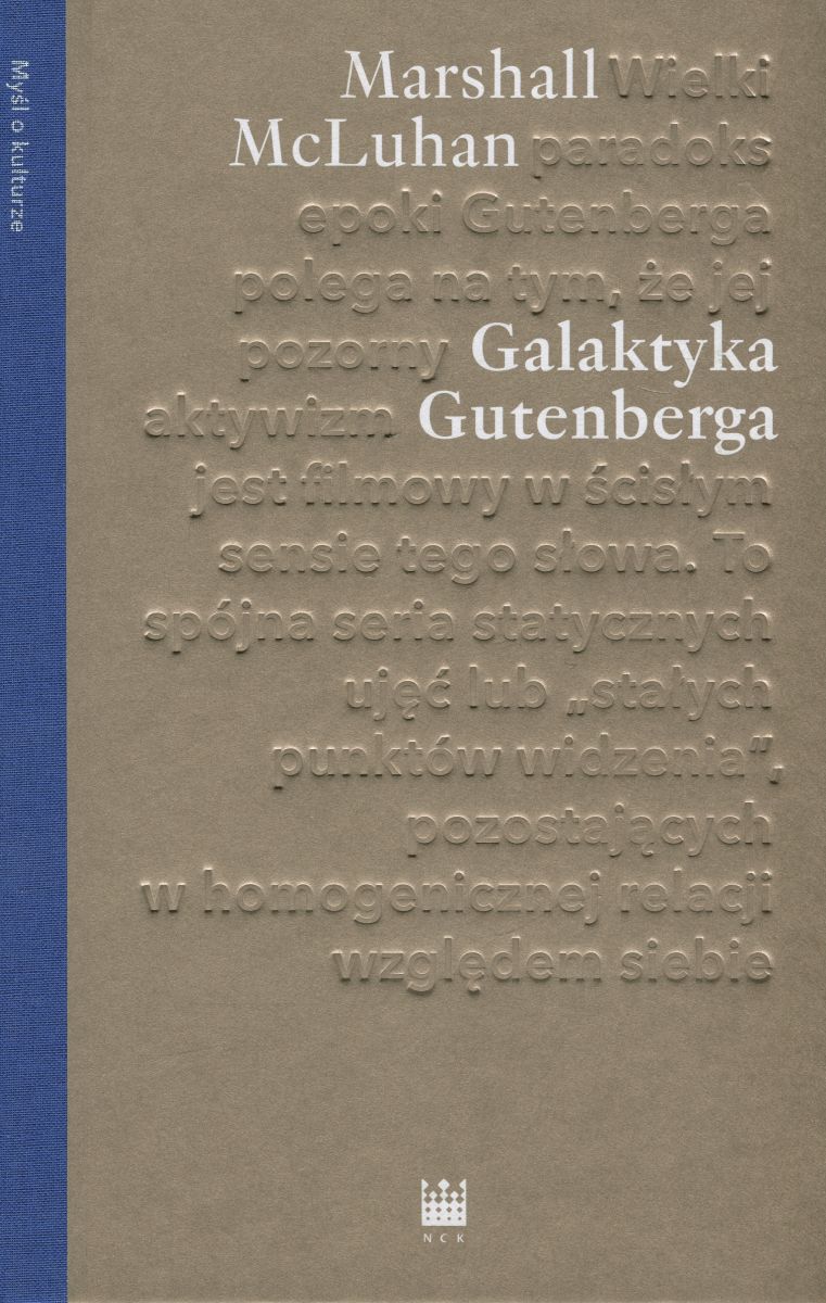 w Cambridge i tytułem profesorskim w University of Toronto), z zamiłowania niestrudzony badacz kultury, występujący przeciwko sztywnym ramom akademickiej nauki. Przedmiotem jego zainteresowania były przede wszystkim role, jakie w społecznym i jednostkowym życiu człowieka pełnią szeroko rozumiane media oraz związane z nimi sposoby komunikacji.Książka Galaktyka Gutenberga. Tworzenie człowieka druku (1962), ukazująca konsekwencje wynalezienia prasy drukarskiej z ruchomymi czcionkami, weszła na stałe do kanonu literatury traktującej o wzajemnych relacjach kultury, społeczeństwa i mediów. Jej pierwsze pełne polskie wydanie oddajemy właśnie w ręce czytelników.Seria: MYŚL O KULTURZEKsiążki, które wpłynęły na sposób myślenia o kulturze, nieznane dotąd w całości w polskim przekładzie. Teksty, które odegrały istotną rolę w formowaniu kulturoznawstwa i kulturologii i okazały się inspirujące do refleksji nad stanem kultury Zachodu. Eseje podkreślające rolę myślenia o kulturze w rozwoju cywilizacji.