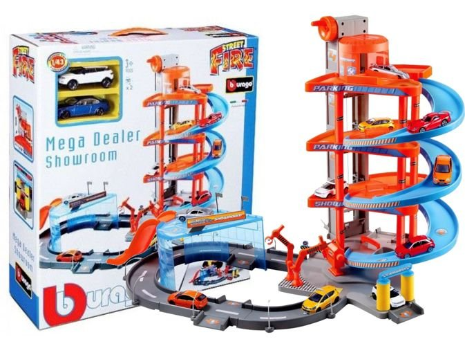 Wielopoziomowy parking posiada dodatkowy tor zjazdowy oraz wiele elementów ruchomych, co zapewni wiele godzin zabawy. Parking posiada 4 poziomy, ruchomą obrotową windę, a na dole na auta czeka automyjnia. Na popsute auta czeka również warsztat serwisowy oraz dystrybutor paliwa. Zestaw zawiera dwa oryginalne, metalowe modele samochodów Bburago z kolekcji Street Fire w skali 1:43. Całość wykonana została z wysokiej jakości tworzywa, z dbałością o każdy szczegół. Zestaw Mega Dealer Showroom jest kompatybilny z wszystkimi modelami Bburago w skali 1:43. x