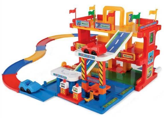 Wader Garaż z drogą - w skład zestawu wchodzi 3-poziomowy garaż z windą oraz myjnią, 2 autka, stacja benzynowa, stanowisko diagnostyczne oraz 3m drogi. Dodatkowo do zestawu dołączono barwną wycinankę, przy pomocy której dziecko może z łatwością stworzyć ciekawe otoczenie.