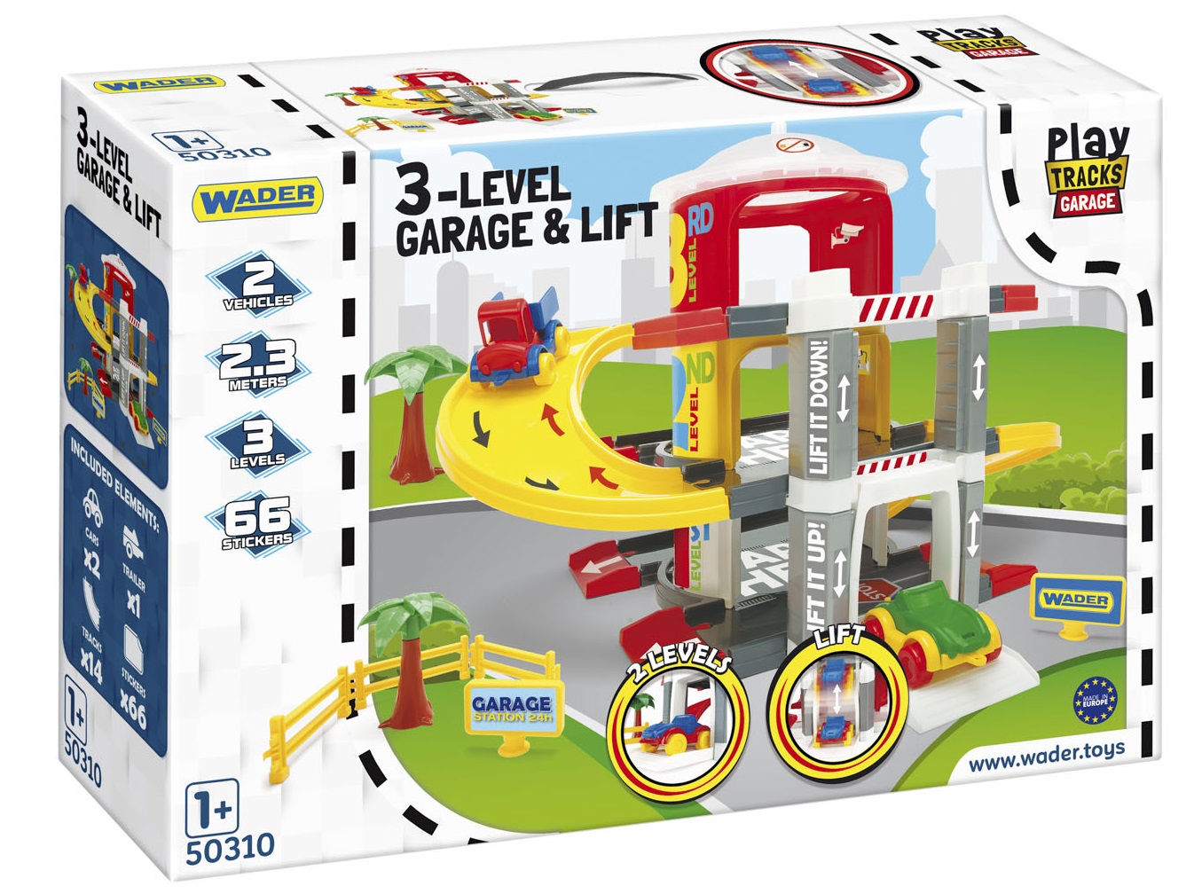 3–poziomowy garaż jest jedną z tych zabawek do których maluch chętnie powraca, bo daje ona wiele możliwości kreatywnej zabawy. Zestaw wyposażony jest w elementy dróg o długości 2,3 metra oraz windę, która przewiezie samochodziki na drugi i trzeci poziom.