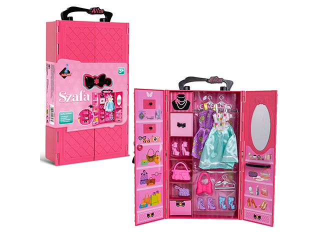 Szafa z ubrankami i akcesoriami, 3 sukienki, 3 pary butów, 2 torebki