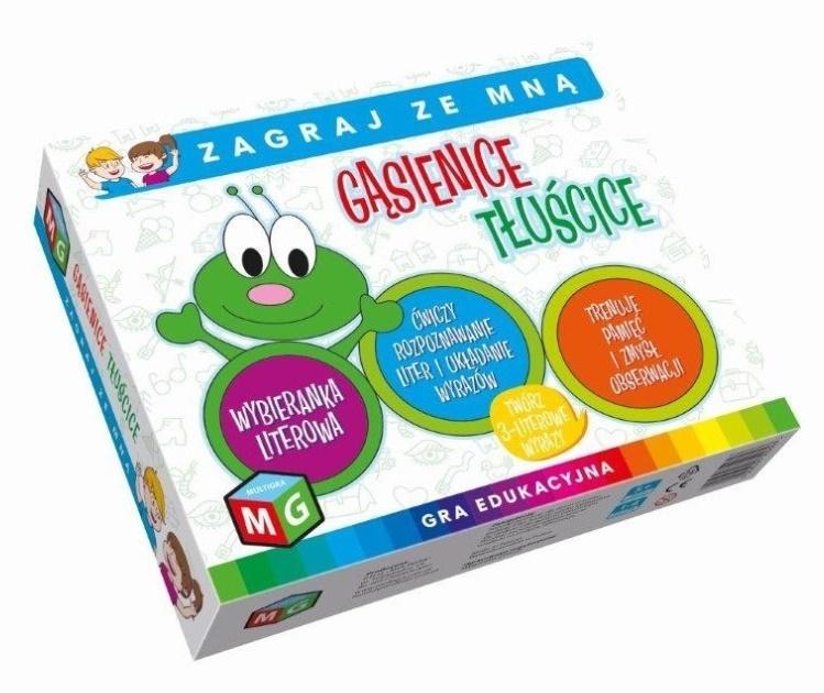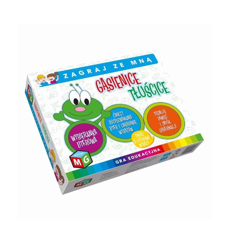"Gąsienice tłuścice" to gradydaktyczna, która uczy dzieci tworzenia 3-literowych wyrazów, usprawnia analizę i syntezę fonemowąwyrazów oraz spostrzegawczość wzrokową. Zabawa polega na wybieraniu przez dziecko pierwszych liter z nazw obrazków prezentowanych przez gąsienice i tworzeniu z nich wyrazów. Proste i miłe dla oka rysunki ułatwiają poprawne rozpoznawanie i tworzenie wyrazów. Zawartość opakowania: plansze gąsienice - 16szt, tabliczki z obrazkami -16szt, instrukacja.