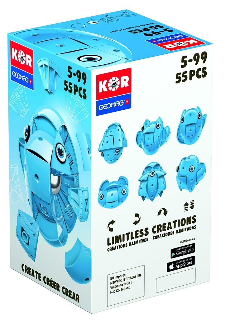 KOR Geomag - zupełnie nowa linia szwajcarskich klocków magnetycznych. Innowacyjny system konstrukcji pozwala na budowanie kosmicznych bohaterów oraz ich przeciwników. Postacie różnią się od siebie kolorem, maskami oraz rodzajami broni.
