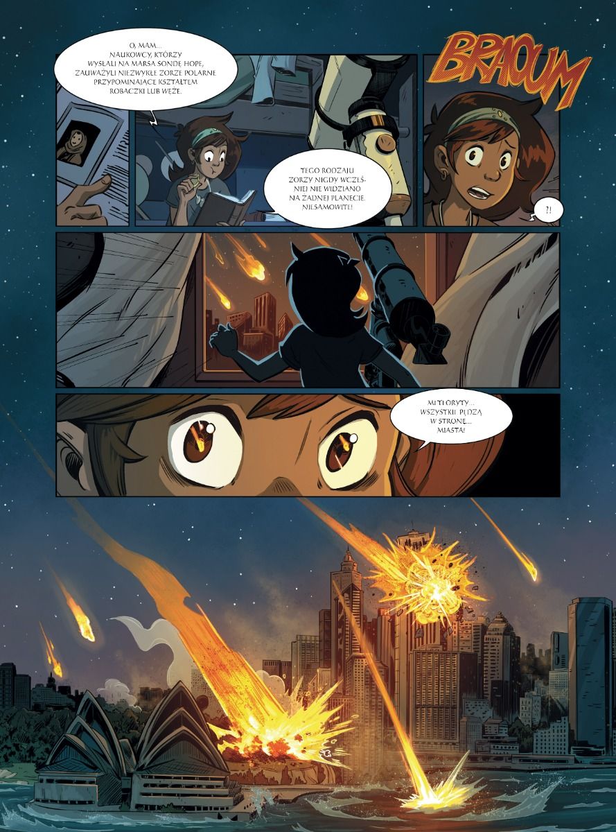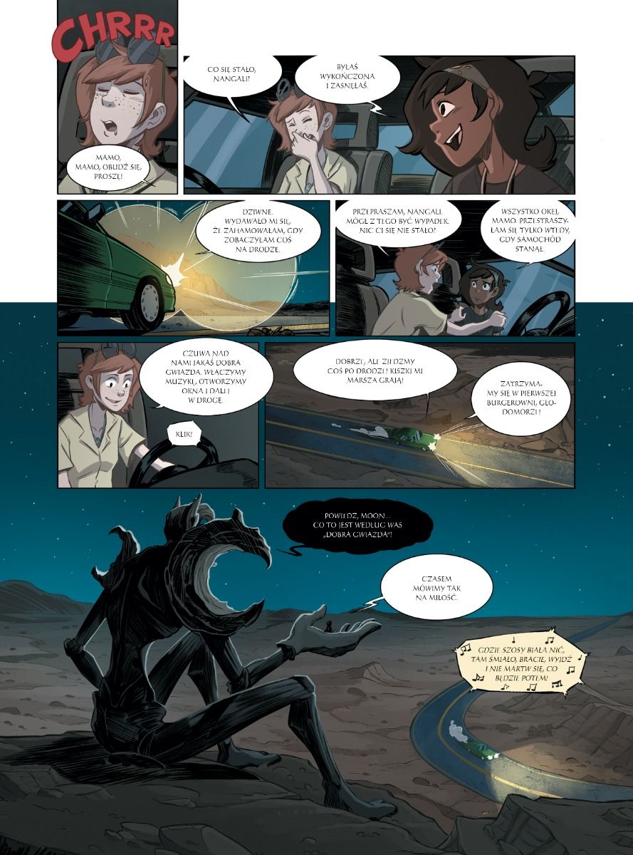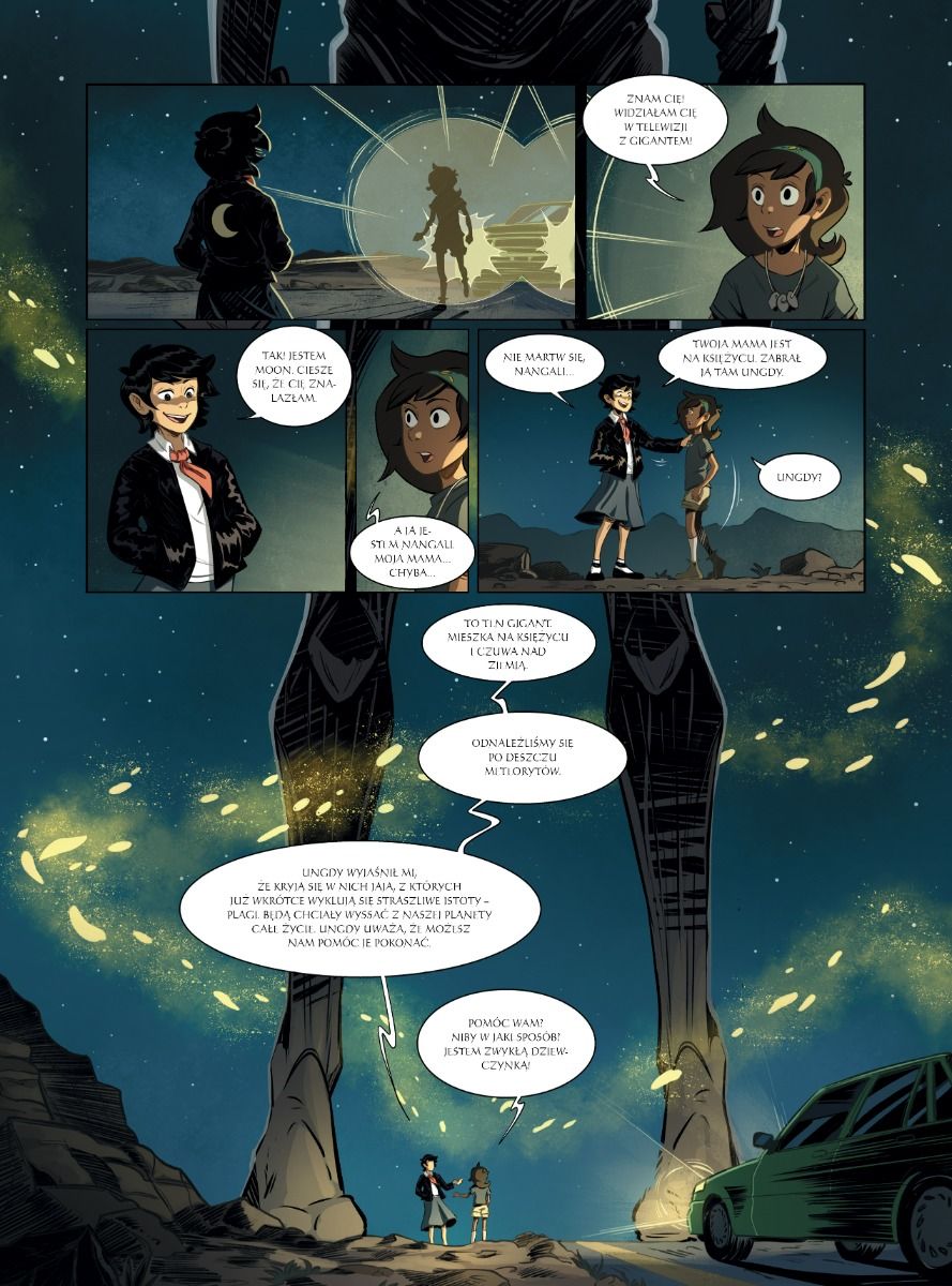 Opis produktuZasady bezpieczeństwaÓsmy tom serii o dzieciach połączonych tajemniczą więzią z niezwykłymi gigantami. Wcześniej deszcz meteorytów uderzył w Koreę Północną. W magmie tych ognistych kul drzemią niszczycielskie stwory, które zagrażają równowadze świata! Ta plaga dotknęła również Australię, gdzie mieszka tata jedenastoletniej Nangali. Mimo że dziewczynka nie widziała swojego ojca od lat, będzie mogła się schronić w tym dzikim regionie, gdzie gwiazdy świecą nocą z niesamowitą intensywnością. Tymczasem w Korei Moon, która odkryła swoje moce, wyruszyła na poszukiwanie innych olbrzymów zdolnych do walki z tą plagą. W towarzystwie olbrzyma, Ungdy’ego, wkrótce odnajdzie Nangali, aby zachęcić ją do przebudzenia swojego olbrzyma! Jeśli Nangali ujawni swoje moce, będzie wielkim sojusznikiem Moon. Razem mogą uratować ludzkość! Autorem scenariusza tej ekologiczno-apokaliptycznej serii jest Kanadyjczyk ukrywający się pod pseudonimem Lylian („Les Aventures débridées de Kenji le ninja”, „La Quête d’Ewilan”) oraz Francuzka Ingrid Chabbert (nominowana do Nagrody Eisnera za dwutomową serię „Elma, une vie d’ours”). Natomiast za rysunki odpowiada rysownik wszystkich wcześniejszych tomów serii „Giganci”, Francuz Paul Drouin („Titouan”, „LʼAventure fantastique”), a także Charline Forns, znana jako jedna z autorek serii „Strażniczka Małych Ludzi”. x