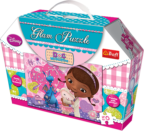 Klinika dla pluszaków Puzzle Glam Puzzle 50 elementów z doktor Dosią, owieczką Besią i smokiem Stefanem bohaterami serialu animowanego Dineya 'Klinika dla pluszaków"". Po ułożeniu powstanie obrazek o wymiarach 41x27,8cm. Puzzle Glam to idealna zabawka dla każdej dziewczynki, która lubi błyszczeć. Puzzle są ozdobione delikatnym, pyłkowym brokatem i po ułożeniu będą wspaniałą ozdobą pokoju. Opakowanie posiada wygodny uchwyt.