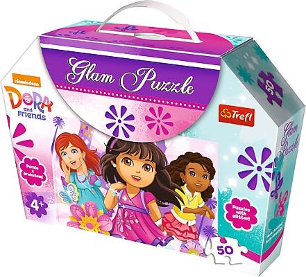 Puzzle 50 elementów. Po ułożeniu powstanie obrazek o wymiarach 41x27,8cm. Puzzle Glam to idealna zabawka dla każdej dziewczynki, która lubi błyszczeć. Puzzle są ozdobione delikatnym, pyłkowym brokatem i po ułożeniu będą wspaniałą ozdobą pokoju. Opakowanie posiada wygodny uchwyt