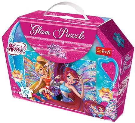Magiczne wróżki - Puzzle GlamPuzzle 100 elementów z bohaterkami serialu ""Klub Winx"". Po ułożeniu powstanie obrazek o wymiarach 41x27,8cm.Puzzle Glam to idealna zabawka dla każdej dziewczynki, która lubi błyszczeć. Puzzle są ozdobione delikatnym, pyłkowym brokatem i po ułożeniu będą wspaniałą ozdobą pokoju. Opakowanie posiada wygodny uchwy