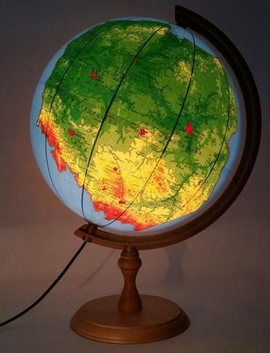 Globus 320 mm mapa Polski administracyjno-fizyczna. Po jednej stronie kuli mapa fizyczna Polski, po drugiej mapa z podziałem administracyjnym. Podświetlany.