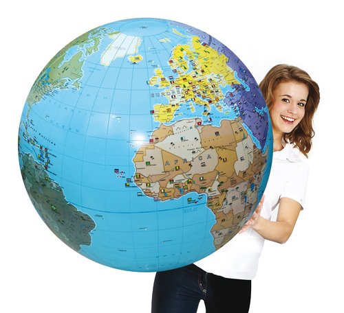 Starannie przemyślana grafika, najwyższej jakości nadruki, piękna kolorystyka, precyzyjna geografia i kartografia polityczna z flagami poszczególnych krajów czynią z tego produktu wyjątkowy produkt. Lekki jak powietrze globus pozwala na zabawę samemu lub w grupie. Można go też wyeksponować, zawieszając na przezroczystym haczyku lub umieszczając na nadmuchiwanej podstawie. Każdy kontynent ma swój własny kolor, ikony symbolizujące inną scenerię, a kompas pozwala z łatwością znaleźć kierunek. Piłka globus jest do nadmuchania, opakowanie nie zawiera pompki.