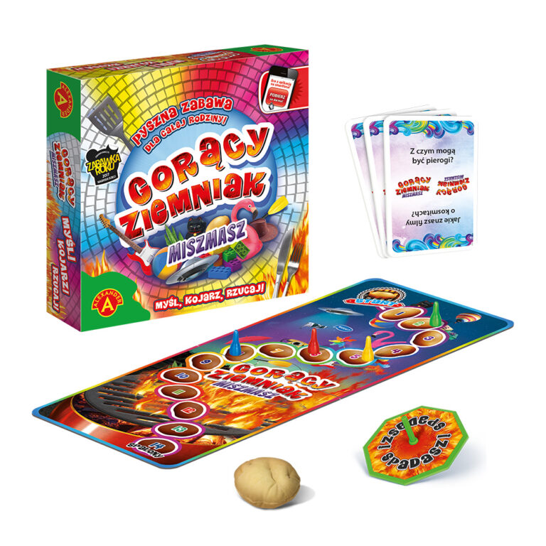 Opis produktuZasady bezpieczeństwaGra, która zawojowała rynek gier planszowych i sprzedała się w setkach tysięcy egzemplarzy w nowej odsłonie. Doskonale sprawdzi się zarówno jako gra rodzinna jak i gra imprezowa. Niesamowita mechanika gry, która sprawia, że doskonale bawić się będą przy niej wszyscy, niezależnie od wieku, upodobań, temperamentu. Zasady gry są bardzo proste i każdy gracz przyswoi je w zaledwie kilka minut. Rozkładamy planszę na której ustawiamy pionki. Losujemy kartę z talii i czytamy jedno z czterech pytań, które się tam znajdują. Następnie energicznie kręcimy bączkiem lub uruchamiamy aplikację do odmierzania czasu dostępną do pobrania na smartfona. Ten, kto trzyma pluszowego ziemniaka musi udzielić odpowiedzi na zadane pytanie. Po udzieleniu odpowiedzi jak najszybciej przekazujemy ziemniaka osobie po swojej lewej stronie (zgodnie z ruchem wskazówek zegara) i ona również musi udzielić odpowiedzi na to samo pytanie. Ziemniak tak długo krąży pomiędzy graczami aż bączek odmierzający czas przestanie się kręcić lub aplikacja na telefonie pokaże stop. Wówczas osoba, która w tym momencie miała pluszowego ziemniaka w ręce, spada o jedno pole na planszy. Siłą gry są wyjątkowe pytania oraz nieprzewidywalne odpowiedzi. To, że wszyscy gracze odpowiadają na jedno i to samo pytanie, powoduje, że pozornie proste zadanie wywołuje szereg nieoczywistych, śmiesznych, ciekawych sytuacji językowych. Pytania są tak skonstruowane, że aby udzielić odpowiedzi nie trzeba mieć specjalistycznej wiedzy. Większość z nich zahacza o znane nam dobrze obszary naszej codzienności. Dzięki zabawie z Gorącym Ziemniakiem rozwiniemy nasze kompetencje językowe, poszerzymy zasób słownictwa, a osoby nieśmiałe będą mogły nabrać pewności siebie.