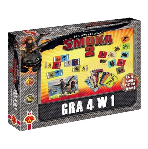 4 w 1 - Jak wytresować Smoka 2"" to zestaw 3 różnych gier i 60 puzzli do układania. Wszystkie gry i puzzle łączy wspólny temat. Charakter gier jest zróżnicowany. Prosta gra w karty ""Piotruś"" wzbudzi największe zainteresowanie u najmłodszych. Gra ""Pamięć"" to emocjonująca gra i dobry trening pamięci dla każdego. W zestawie znajduje się również ""Domino obrazkowe"", a także puzzle, które są dobrym treningiem cierpliwości i skupienia. Zawartość pudełka: 25 kart Piotrusia, 28 elementów domina, 40 tabliczek pamięci, 60 puzzli, instrukcja.