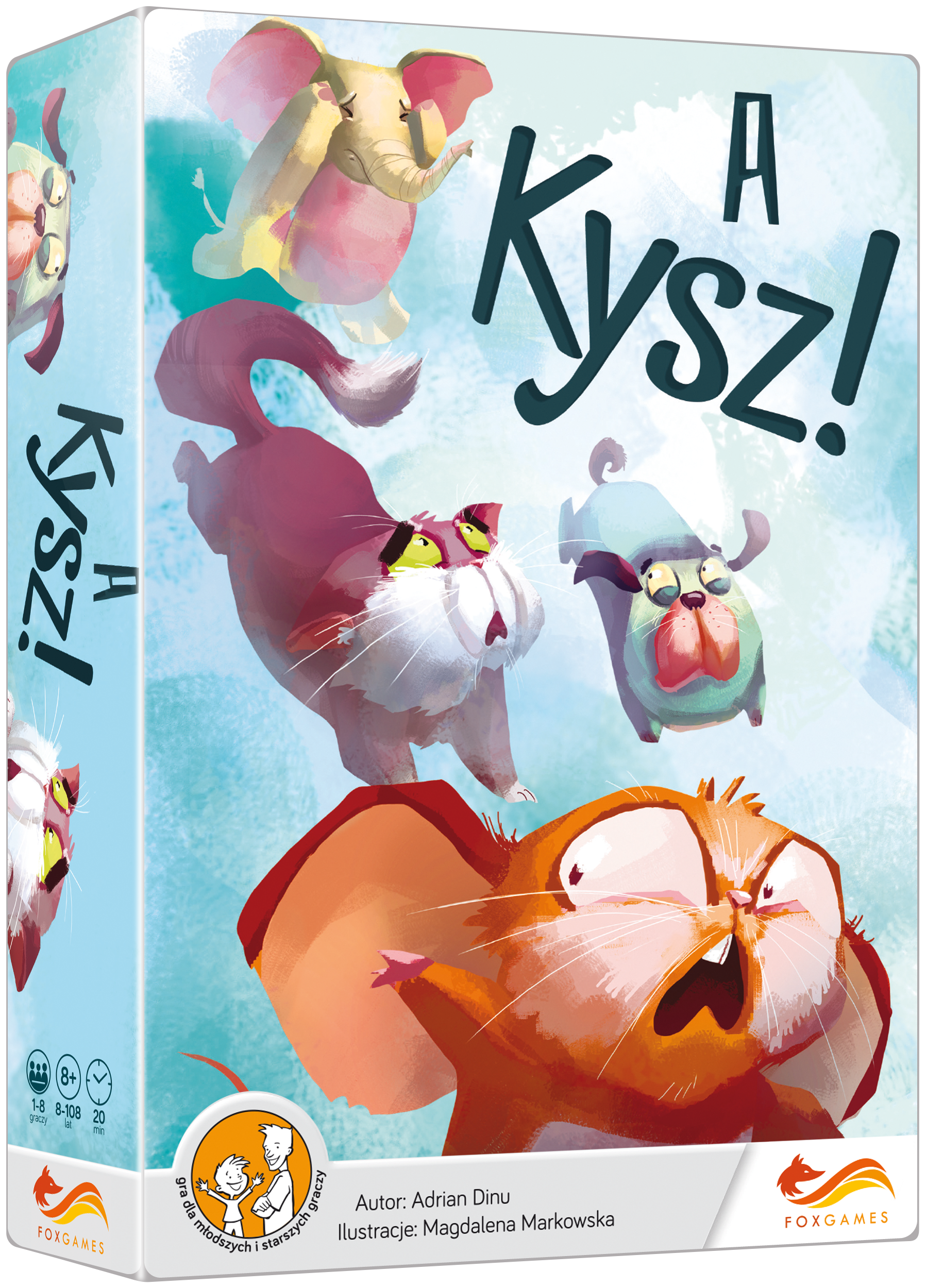 Słoń boi się myszy, mysz kota, kot ucieka przed psem, a pies przed słoniem. Zwycięży ta osoba, która jak najlepiej poradzi sobie z tą niecodzienna układanką. Jak grać? 1, Gracz w sekrecie dowiaduje się, które zwierzę i kolor stada należy do niego. 2,W swoim ruchu przekłada jednego zwierzaka tak, aby przestraszył on innego. 3,Wygrywa gracz, który na końcu gry będzie miał na stole jak najliczniejsze stado. Celem gry A kysz! jest zdobycie jak największej liczby punktów. Gracze otrzymują je za każde zwierzę, które na koniec gry pozostanie na stole i będzie pasowało do kart sekretnych celów danego gracza. Wiek graczy: 8+ Liczba graczy: 18 graczy Długość rozgrywki: 15-20 minut x